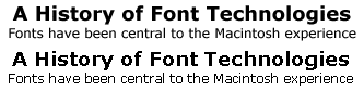 In Mac OS 8.5, Apple brought the technology of anti-aliasing to the Mac. When the Mac calculates a font with TrueType to decide which pixels to make black or white, the results can look slightly different on the screen and on a printer. Anti-aliasing (in this simplified description) allows the Mac to display grays on the screen to smooth out the fonts, as in the top two lines of the figure below.
