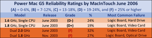 - See: Power Mac G5 Overview and Hardware Reliability (Article + MacinTouch 2006 Stats)
