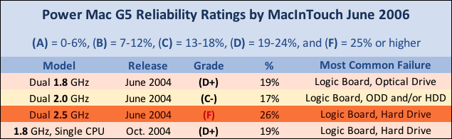 - See: Power Mac G5 Overview and Hardware Reliability (Article + MacinTouch 2006 Stats)