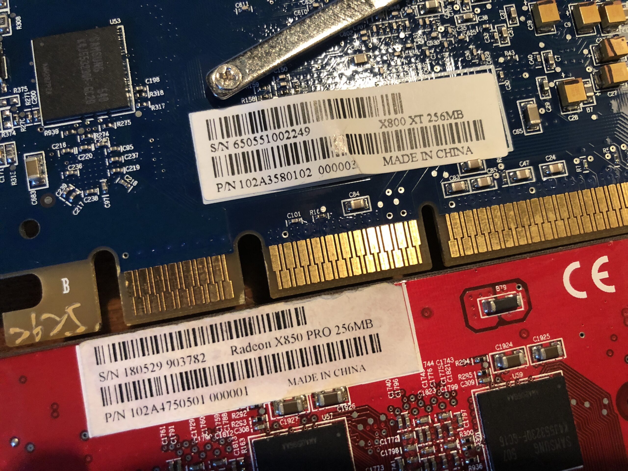Spot the differences! The blue card is a stock Mac Radeon X800XT 256 MB, versus the flashed X850 Pro PC version.