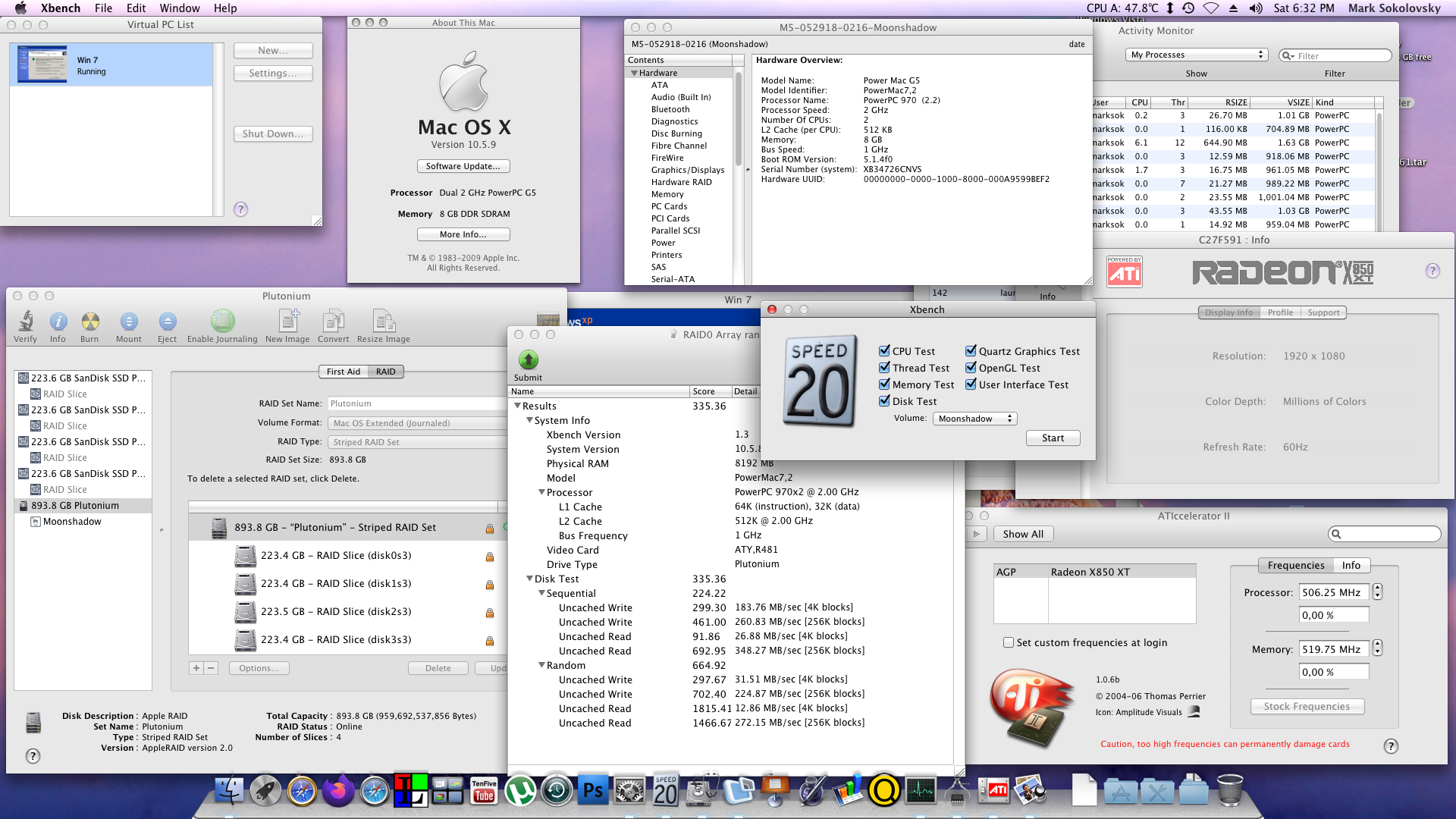 - Well, what does it look like, after all those upgrades? The machine indeed becomes a powerhouse. Folks, I have difficulty conveying through this article how substantial the impact of the hardware modifications are, on the performance of this computer. Some may see yet another wild computer project here, but there was a moment where it hit me, all the while I was testing some apps, thinking to myself.. whoa, this feels like an intel Mac. It’s not just one specific thing, it’s everything together. I’d dare say the RAID0 array is pulling the weight of the performance increases of the computer, but without the upgraded GPU, animations would chug. Either way, performance is in another league of it’s own above where it used to be with stock hardware, for sure.