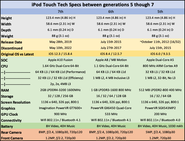 The latest and greatest device to bear the same name as the revolutionary “1000 songs in your pocket” was a spec-bumped version of the 6th Generation iPod touch. Featuring double the ram, and base storage of its predecessor as well as other iterations. This device can officially run all the way up to iOS 15.8.4, shipping with iOS 12.3 upon it’s debut.