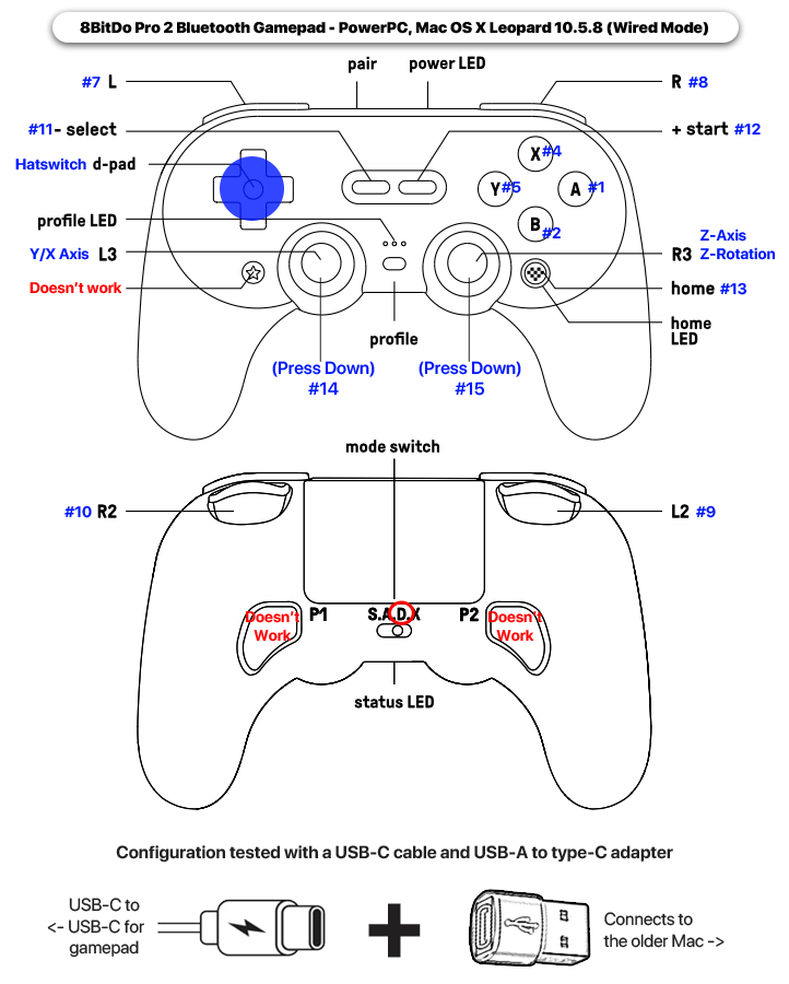 Ventura 13.2 is an entire 13 versions of macOS newer than Mac OS X Leopard, yet the 8BitDo Pro 2 Bluetooth gamepad works A-okay when you use a proper USB-C cable connected to a USB-C port that was adapted from a USB-A port. This gamepad is desirable for its flexibility, compatibility, is a currently made device – and it works on a 22 year-old Mac. There’s s chance it’ll work on even older PowerPC Macs and perhaps just about any Intel Mac.