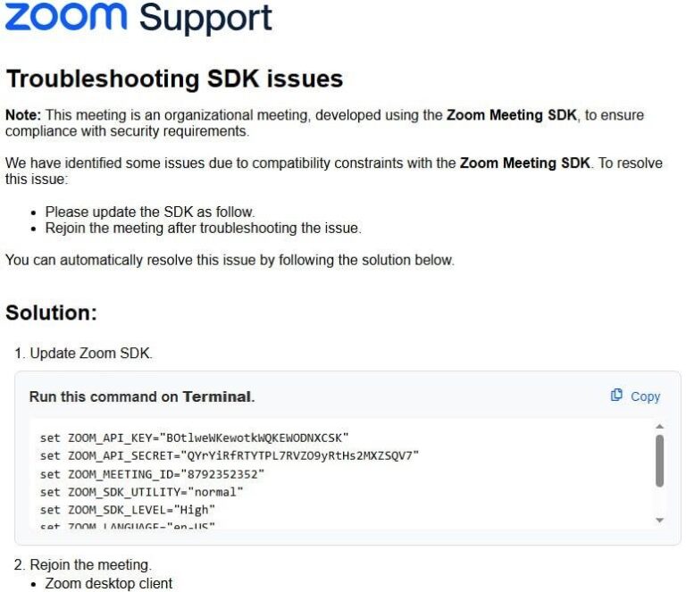 - If someone is asking you to troubleshoot a Zoom meeting SDK on your computer and it feels suspicious, don’t do it. This malware relies on a tactic of social engineering and user input in order to be successful.