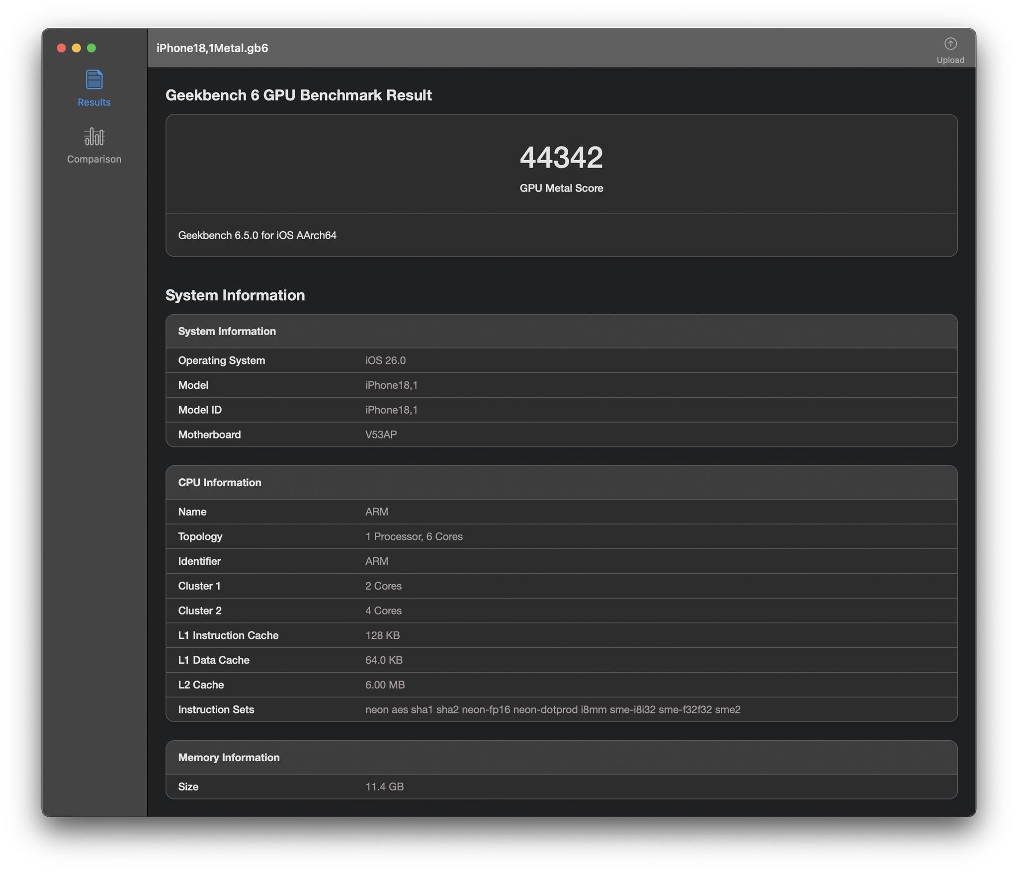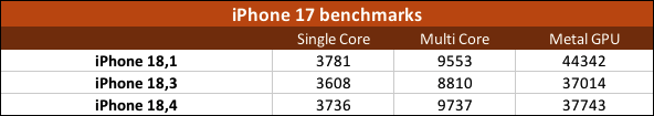 iPhone18,1 appears to be the iPhone 17 Pro, as the score leaps over the other two iPhone scores. The iPhone Air and iPhone 17 both ship with a 5-core GPU, whereas the iPhone 17 Pro ships with a 6-core GPU, resulting in a higher Metal GPU score. CPU multicore and single core scores appear to be similar.