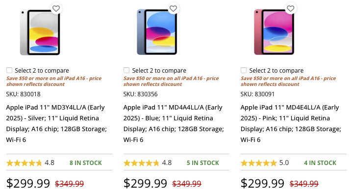 You can also pick up the latest iPads at a discounted rate at Micro Center, starting at $299. The base 128 GB M3 11″ iPad Air is $60 off at $539, the 11″ M4 iPad Pro is $100 off, and they even sell refurbished 7th-gen iPads for $179.