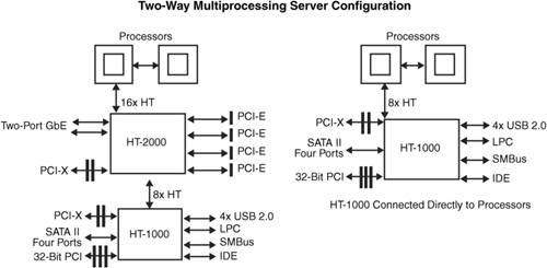 Broadcom says the HT-1000 can technically be used as a north or south bridge. In the BCM5780 configuration, HT2000 is the mid bridge, HT1000 is the south bridge.