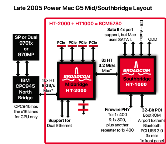 When the Dual-Core PowerPC 970MP third-generation G5 CPUs came out in Mid-2005, Apple had to start using a brand new Mid Bridge chip for the Macs along with it. Since the AMD 8131 only had PCI-X bridges and no PCIe bus, they couldn’t keep the old chip, replacing it with the BCM5780.