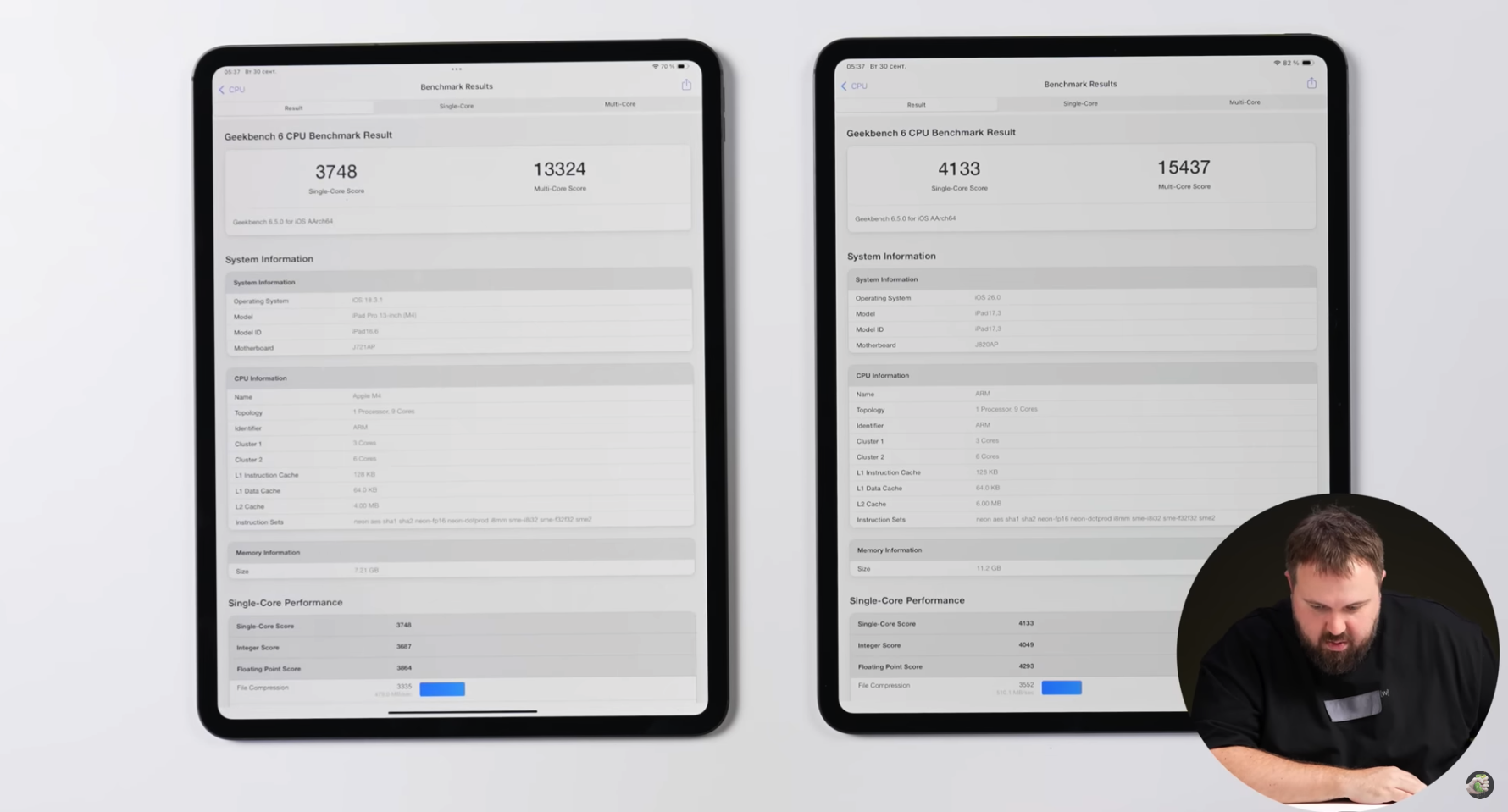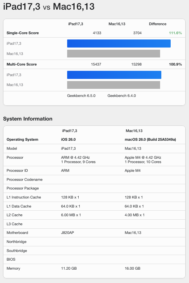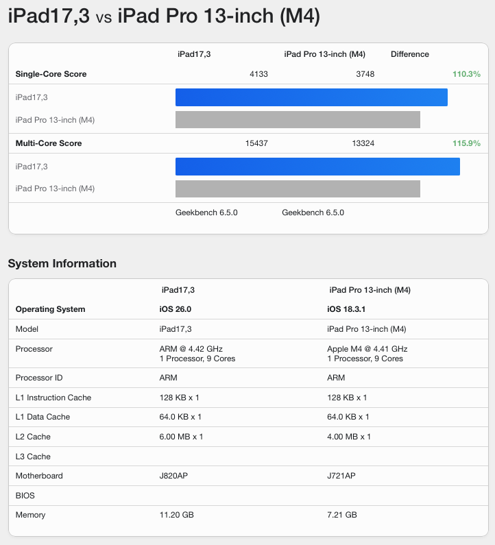 When comparing the M4 iPad Pro to the leaked M5 iPad Pro, we see a 10% increase in single core performance, as well as a 15% over the multi-core. Having a single core score of 4133 puts this ahead of even the likes of the M4 Max, which is a feat on its own. With a multi-core score of 15,437, this fully matches the M4 chip in the 15-Inch MacBook Air.