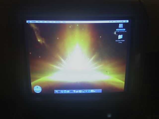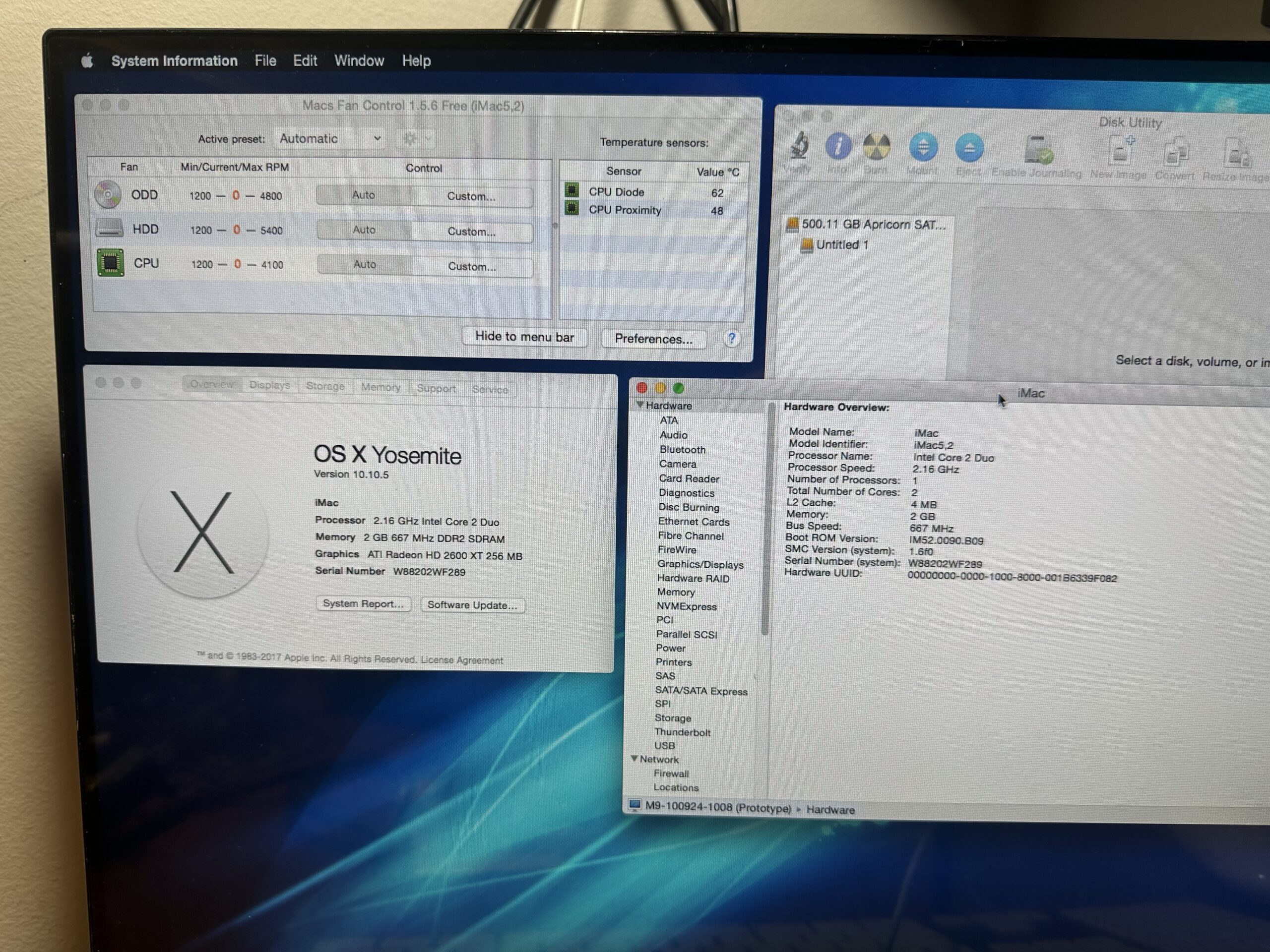 I’ve covered iMac in a shelf, but here’s another one I did – it runs entirely off the 32 GB sandisk drive, with Yosemite Piker Alpha. It’s a 2006 17-Inch education model iMac with the wires spliced to power a Mac Pro 3,1 GPU. It now has graphical hardware acceleration for all Mac OS X versions up to 10.11 Capitan.