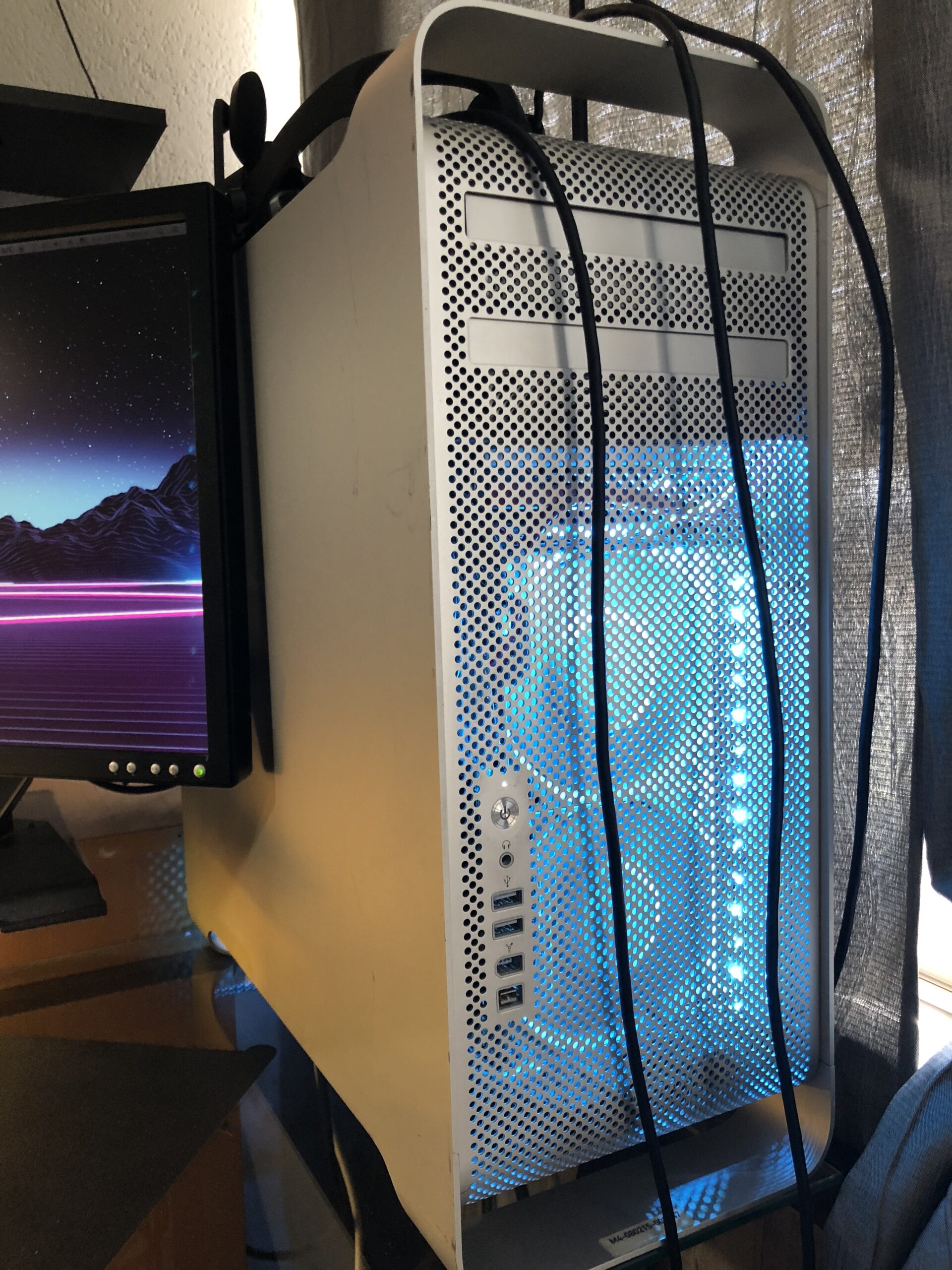 There are multiple things going on here: Aqua Blue LED light modification, an Asus Strix GTX 980 TI is in the Mac Pro, it’s running El Capitan with a Piker Alpha mod, and it dual booted Windows 10. I did this back in 2017 to prove you didn’t need an AMD FX-8350 to run VR.