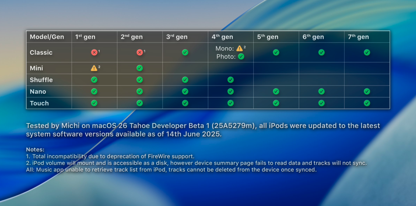 An individual online was able to test out multiple generations of iPods with the macOS 26 developer beta 25A5279m, so you can see for yourself what does and doesn’t work.
