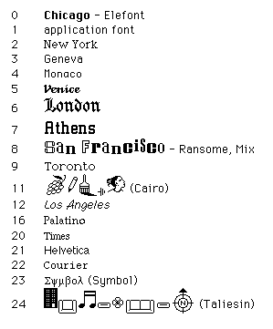 I have opened all this this font files with FontEditor and installed them into suitcase called Susan Fonts. I will upload them to Macintosh Garden. I had to add font ID’s to them from 30 to 34. The allowable ID range in the font manager is from 0 to 255. Numbers 1-127 were reserved by Apple. The orignal Apple fonts came with this Font ID’s: