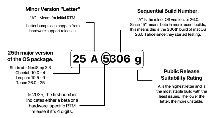 . - A – This is preparing to be the “A” release for consumers, as this is a beta build of a future RTM release. This denotes the “.0” in the “macOS 26.0”. This may also be incremented for new hardware releases.