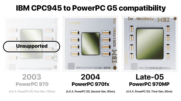 Although it’s not known whether or not a CPC945 has ever been paired with a first-generation 970, it is easier to say it’s unsupported. By the time this chipset and those chips came out, IBM already moved onto 90 nanometers, away from the 130 nanometer fabrication size of the 970 and CPC925. Theoretically it may be equally as possible as it may be not, to pair the older chip with the newer chipset.