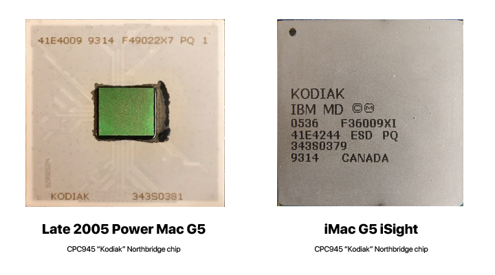 The IBM CPC945 is a redesigned Northbridge chip mostly for the Dual-Core PowerPC 970MP CPU. It has technical upgrades over the IBM CPC925, including a faster HyperTransport Bus. It’s also capable of talking to the PowerPC 970fx second-generation G5 chip, which means it may be found in other Late 2005 Macs on the logic board.