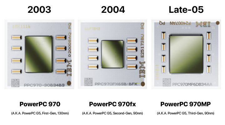 The second G5 CPU, the PowerPC 970fx, was built on IBM taking its lessons from the first-generation 970, whilst simultaneously pushing towards the 3 GHz goal. The chip maxed out at 2.7 Ghz, still shipping as far along as Early 2005 Power Macs G5s. As a result, they fell short of their “GHz” goal, which is partly what prompted Apple to switch to Intel.