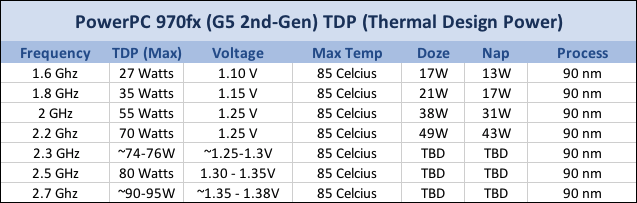 Official documentation states 35 Watts at 1.8 Ghz, which is what the 1.8 GHz PCI-X single-CPU Late 2004 Power Mac G5 has. IBM doesn’t have much (if any) official documentation past 2.2 GHz, so these are scaled estimates.