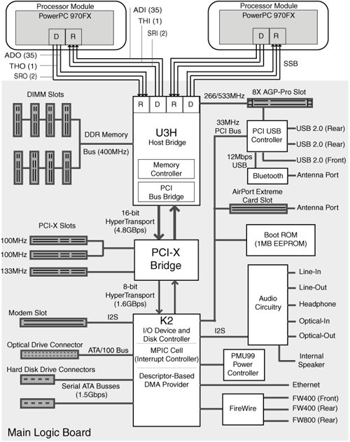 This is an Apple-designed chip made for the Power Mac G5, and used for the first and second generations of PowerPC G5 chips. It is also sometimes referred to as the Apple U3 or U3H (ECC variant) chip, capable of supporting up to two chips. There are two 550 Mhz unidirectional CPU buses, a 400 MHz DDR memory controller, 8x Pro AGP, and a 400 MHz 16-Bit HyperTransport tunnel.