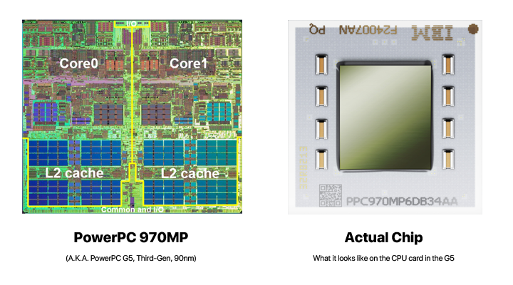 Official documentation shows 70 to 100 watts at 2 GHz in full operation, and 125 watts at 2.5 GHz. Keep in mind this is per-CPU, and may ramp up higher than this when maximally stressed. Despite being on the third iteration, this G5 chip never hit the 3 GHz goal Apple set out. It managed to push performance in other ways, at the expense of thermal management, power consumption, and portability. The PowerPC 970 MP unfortunately solidified the G5 as a power-hugry chip.