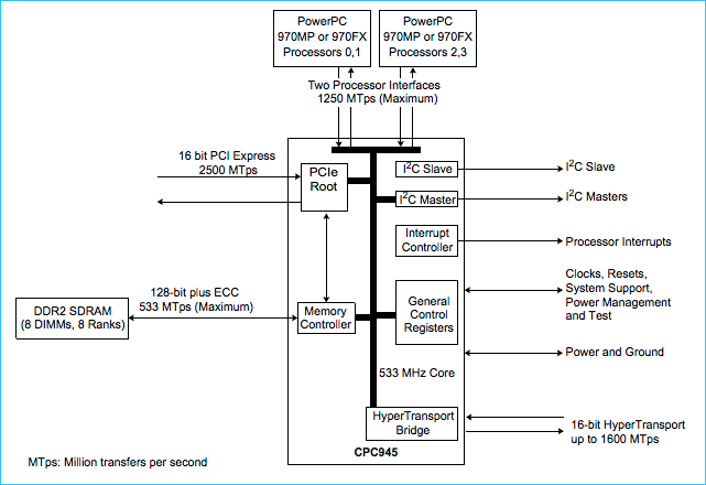 Edit: Using IBM’s own CPC945 Datasheet, I was able to find out the 16-Bit HyperTransport bus runs at 12.8 GB/s. There seemed to be an internal change from GB/s to MT/s at some point, and perhaps someone mislabeled the chart. I can’t find anything on the mid-bridge GB/s and don’t want to provide inaccurate info. If indeed the HT is 12.8 GB/s, that’s a massive jump up from the CPC925 Northbridge chip.