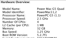 Since the controller can see up to 64 GB of RAM, some attempts have been made (and appeared to be successful but are unconfirmed) in seeing up to 32 GB RAM. The main issue in the past was RAM density and cost, although 8 GB 667 MHz ECC sticks are known to exist and work in a Mac Pro 1,1 and 2,1. Back in 2011, a user named Iroquois in a MacRumors Thread posted screenshots of their G5 Quad on Tiger with 32 GB of RAM.