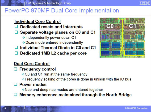 What sets it apart from prior generations in addition to being Dual Core, is the increase in L2 cache from 512 KB to 1 MB. The Power4 was designed with a balanced system/bus throughput design in mind, with native 32-bit compatibility, and a high frequency. The 970MP took these design goals a step further, focusing on a smaller die with lower power consumption than the Power4, enough to fit into a desktop.
