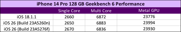 Using the stats from the testing, we can see the iPhone 14 Pro doesn’t actually slow down on iOS 26 beta, but rather, it is a completely new interface which burdens the device differently. As with any beta, the graphics improve over time.