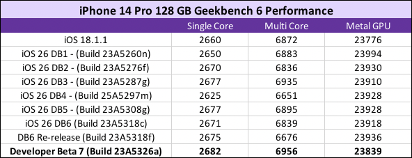 Multicore is back up as expected, and overall performance is getting better and better over the last few beta builds. The home screen still has some stutters on my iPhone 14 Pro, but most animations are quite fast. As I have put it in other recent reviews of Developer Betas of iOS 26 – this new UI is becoming more and more responsive.