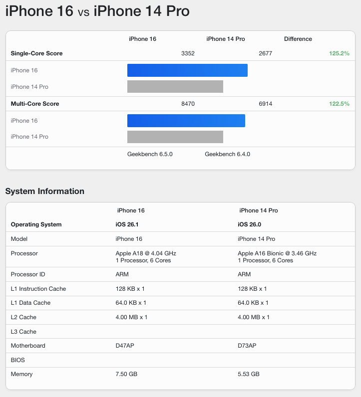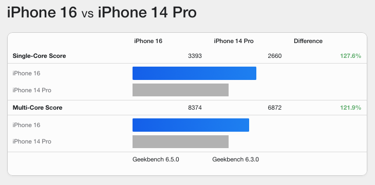 Overall Single-Core and Multi-core performance scores stayed relatively the same, and the iPhone 16 maintained about the same lead in performance over the iPhone 14 Pro I had before sending it out.