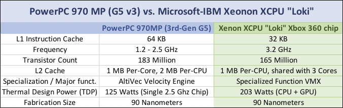 Just like the second-gen 970fx and the third-gen 970MP, the Xbox 360 CPU has a 90 nanometer fabrication size. There are major internal differences between the XCPU and the PowerPC G5 chips, as the XCPU is meant more for gaming while the G5 is more for computing.