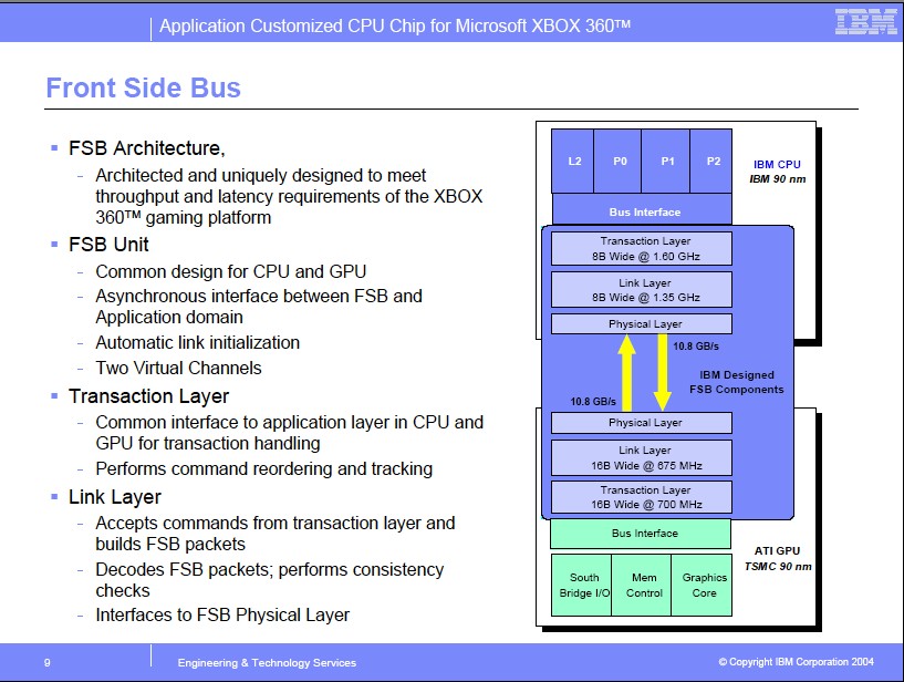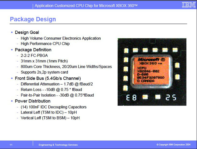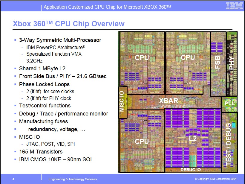 This CPU is notable for being a Tri-Core processor, having 3 cores. On this Xenon, there’s 1 MB of shared L2, 165 Million transistors, and it’s clocked at 3.2 Ghz.