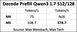 . - Neural GPU Accelerators provide a major boost for AI and AI benchmarks. Max Weinbach saw a 35% increase in performance in Decode Prefill Qwen3 1.7 512/128 when enabling the Neural GPU accelerators in the M5, versus leaving them off.