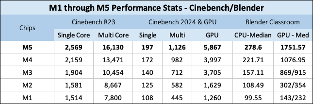 M1 through M5 in Cinebench and Blender