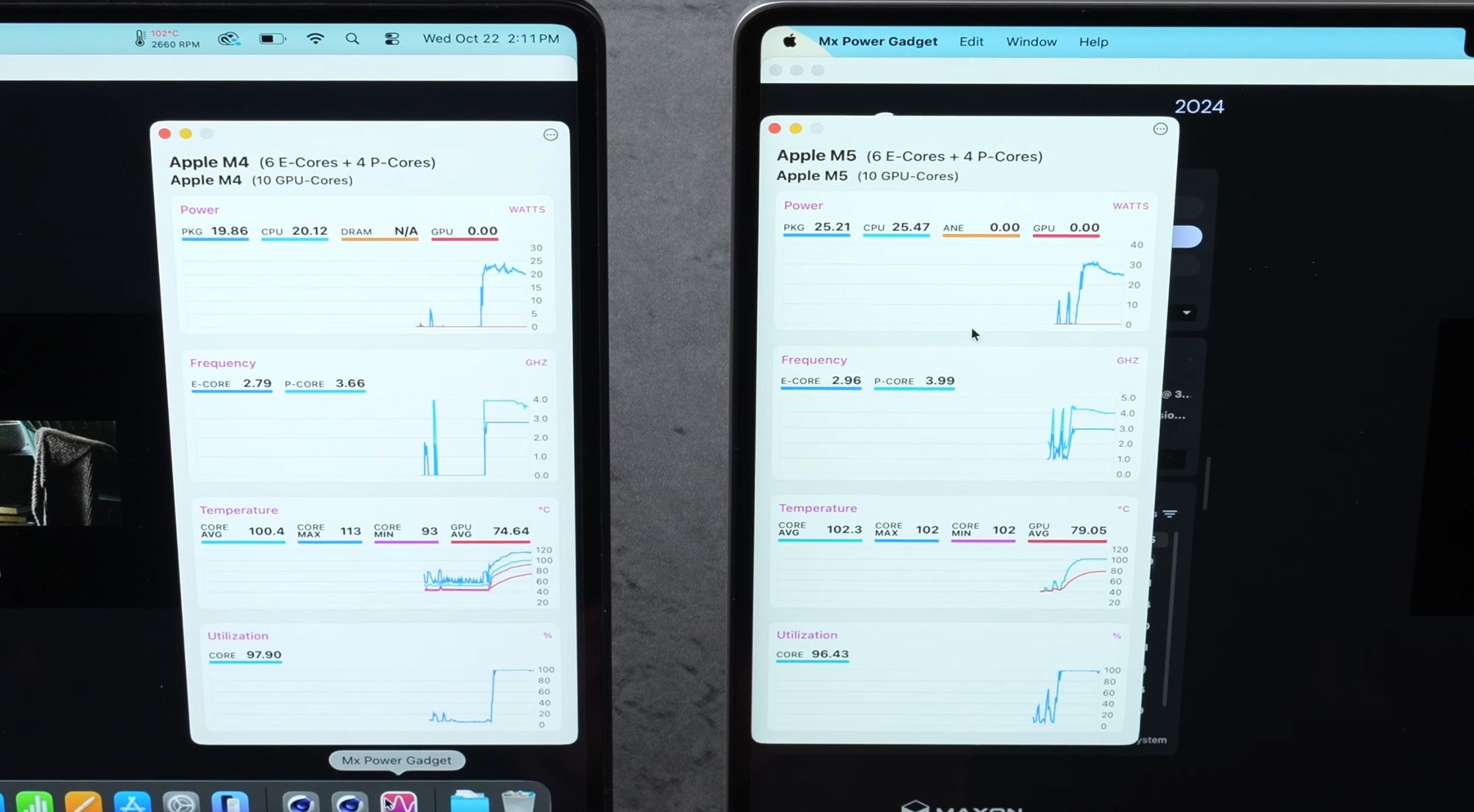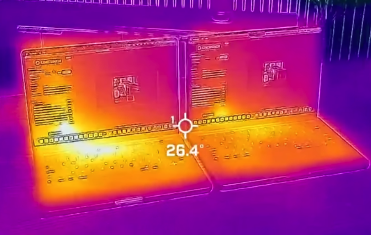 The M5 chip seems to be a hotter-running, more performant chip than the M4, as demonstrated by Luke Miani’s thermal camera when running a Cinebench benchmark. The fan speeds were the same in the M4 as on the M5 ‘Book this test, and Apple designs the chips to hit up to 108c under load.