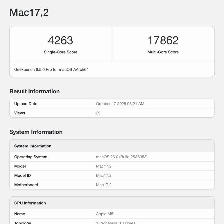 Recently a website called BeeBom posted some benchmarks which reflect what appears to be the new Late 2025 14-Inch M5 MacBook Pro. If there is any indication from this artificial “water pressure test”, the M5 surely has cutting-edge single core performance.