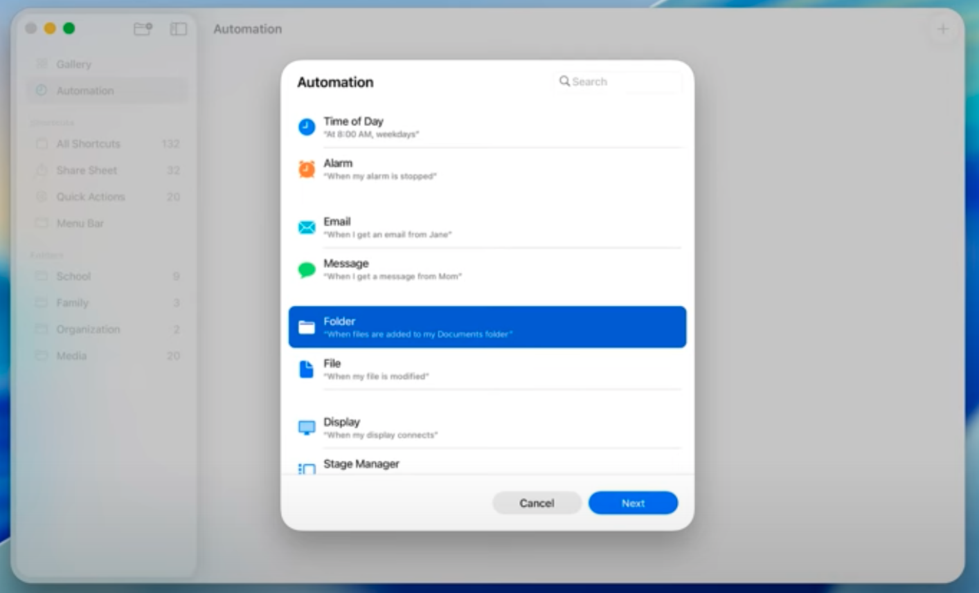 - Run them automatically such as a specific time of day, or when you take actions like saving a fly to a folder, or when you connect a display.