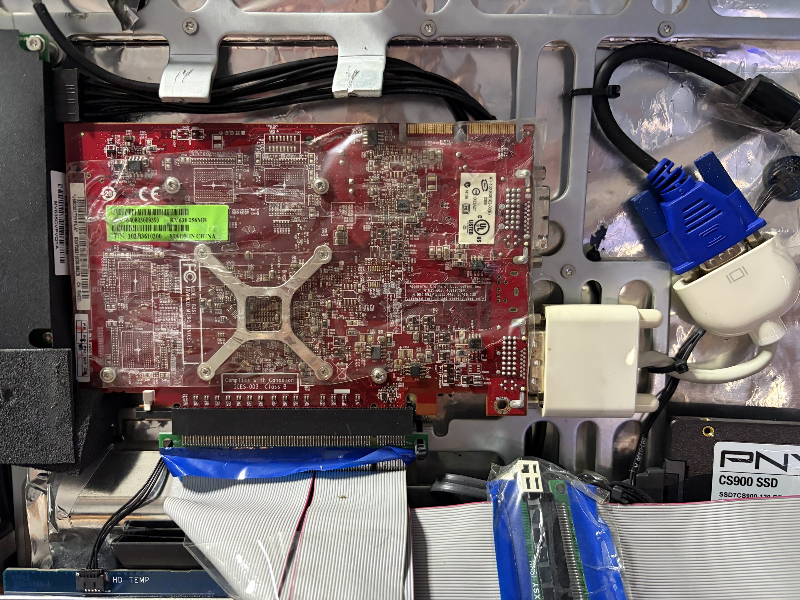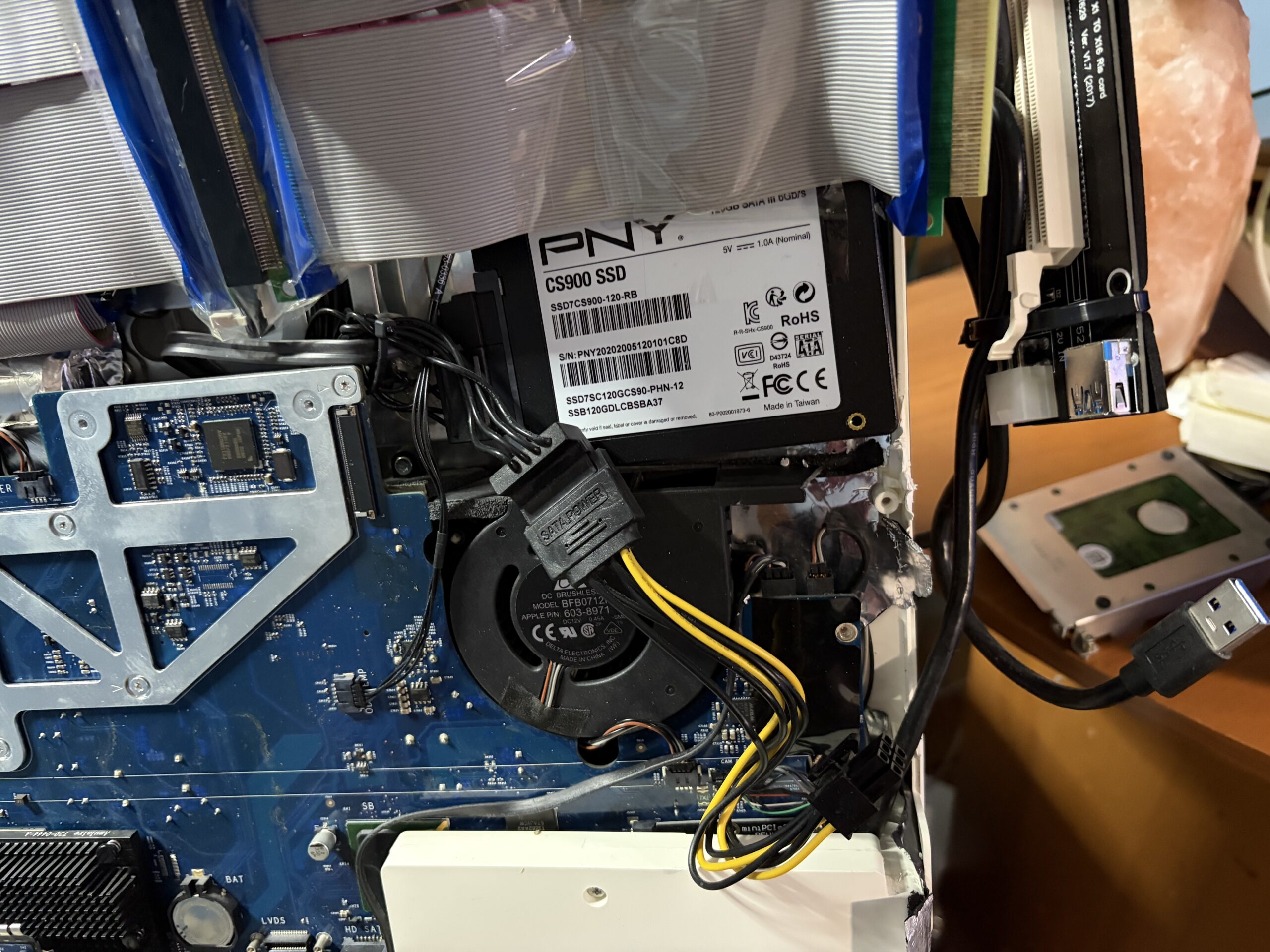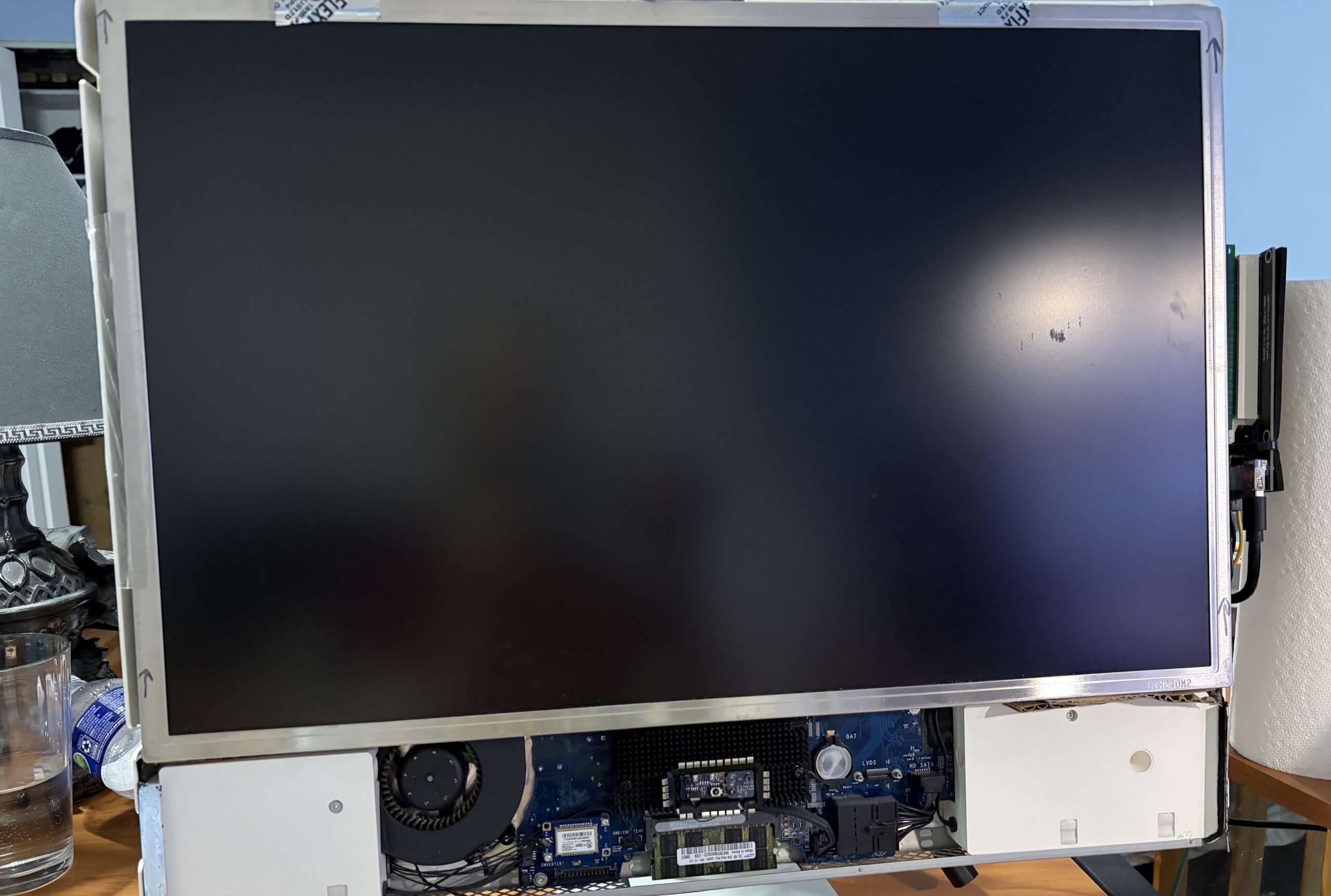 The way I have it taped up, it’s easy access into the system. The only tedious part are the many little power connectors on the side of the display (since it’s an older CCFL), a few of which I snaked through the PCIe connections since there was no other way. The panel itself is rather light, so packing tape is enough to hold it firmly.