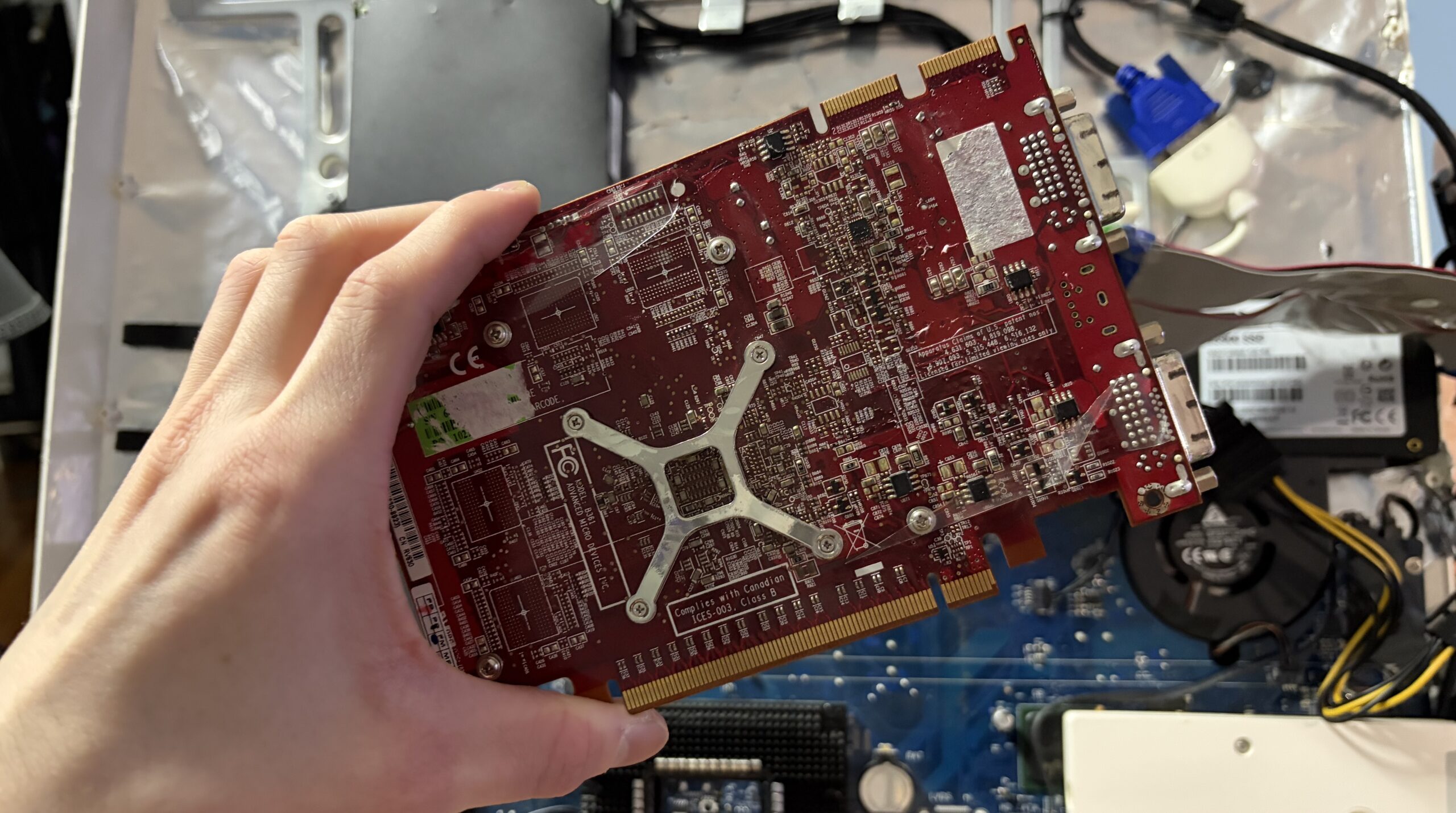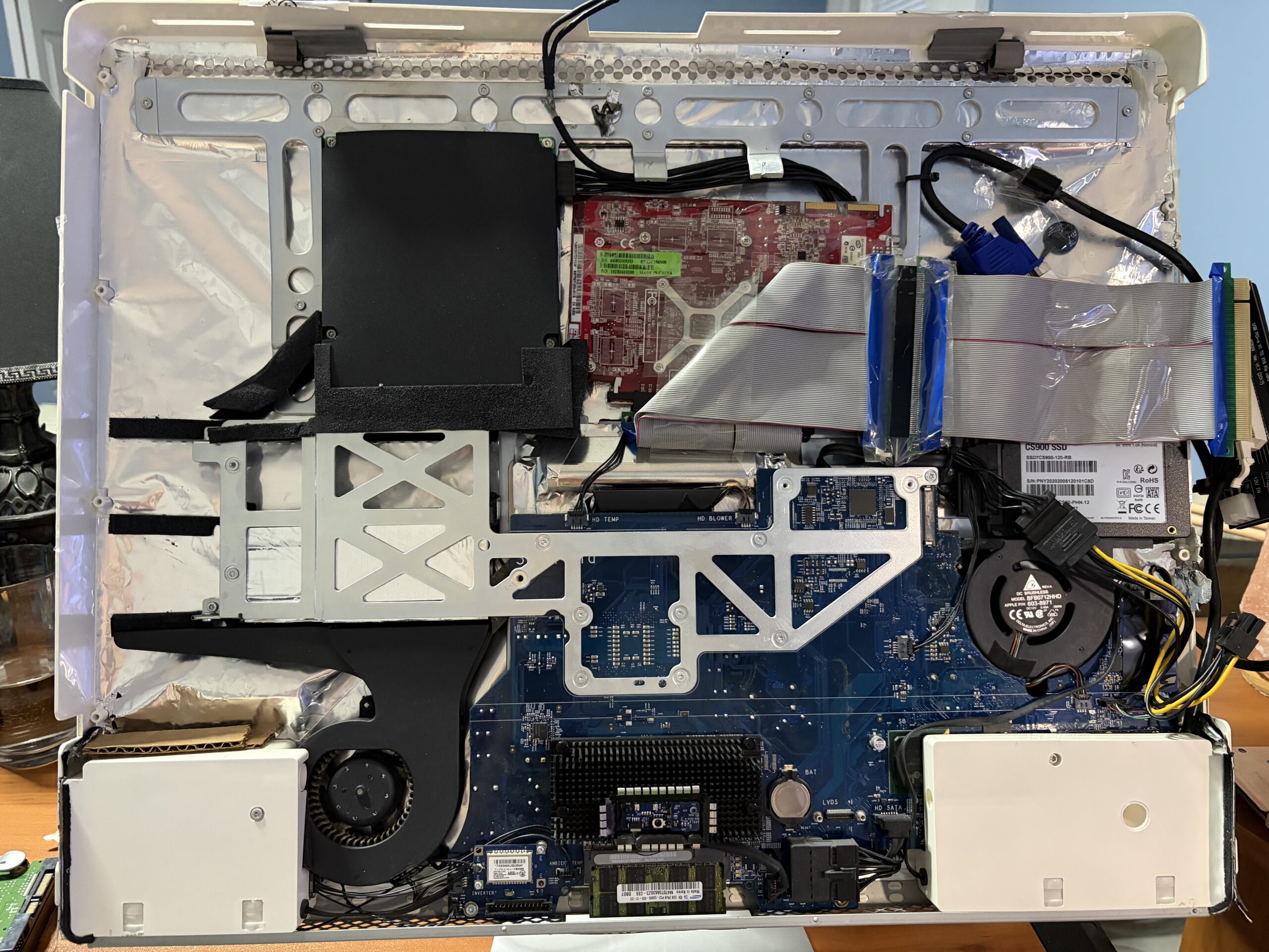 I also noticed lately the graphical UI animations have been stuttering, thinking it was about time to give the graphics card some new thermal paste, and perhaps finally cover those exposed circuit boards on the back of the iMac. It’s a piece of cutout plastic from an old folder taped over, but it works well enough.