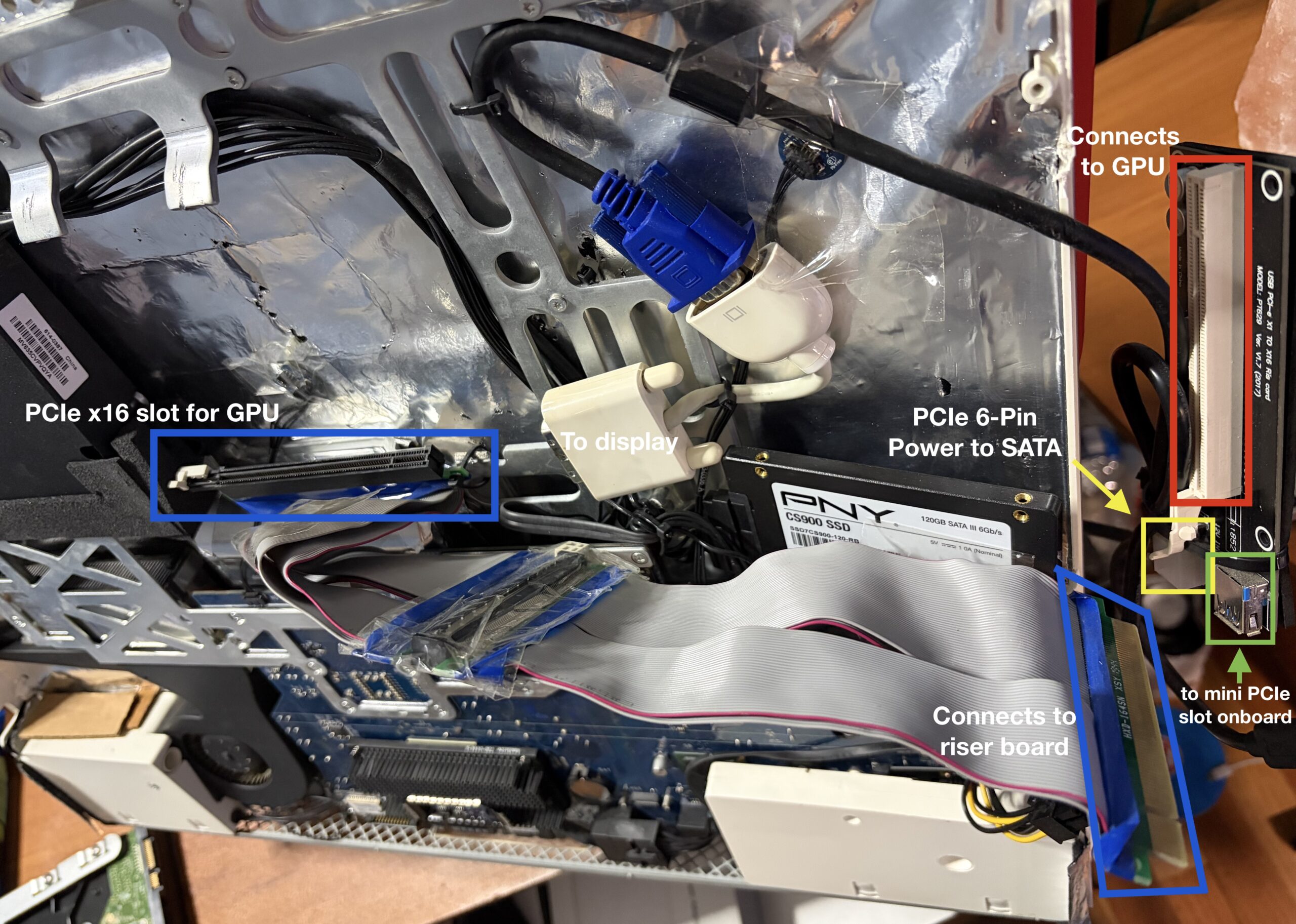 In the image above, the PCIe riser extension cables are folded over to show how the graphics card is placed inside the iMac. If you go with the iMac’s original LCD panel, it’s likely you’ll have to recess the GPU below where the LCD sits, or modify the heatsink so it doesn’t prevent the LCD from being able to sit properly inside the iMac.
