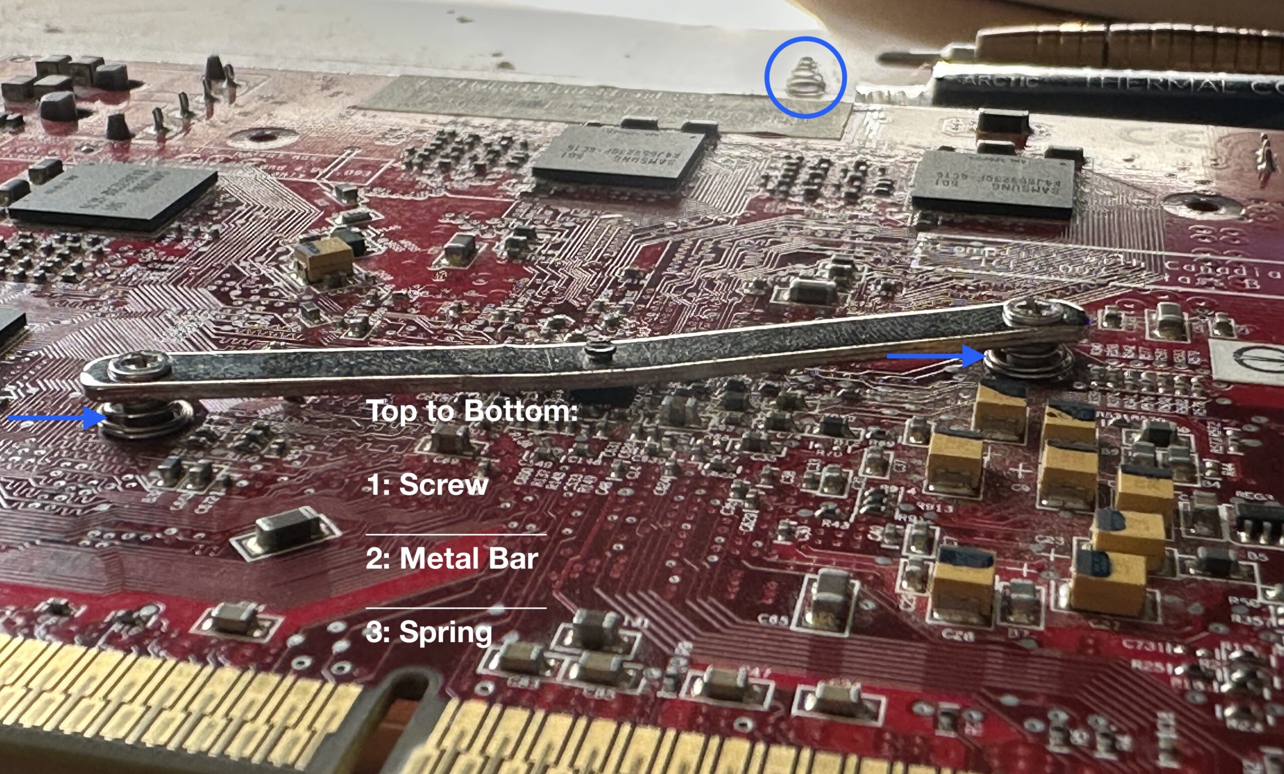 I learned the ATI Radeon X850 Pro doesn’t come stock with springs on its screws, so the pressure mounting vice/piece doesn’t do enough. By taking springs from screws off an ATI Radeon HD 2600 XT and adding them to the X850XT, it provided the right amount of pressure for the heatsink against the GPU.
