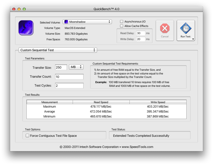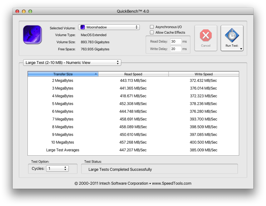 - 483 MB/s Read, 403 MB/s Write, according to Quickbench 4.0.5 Universal