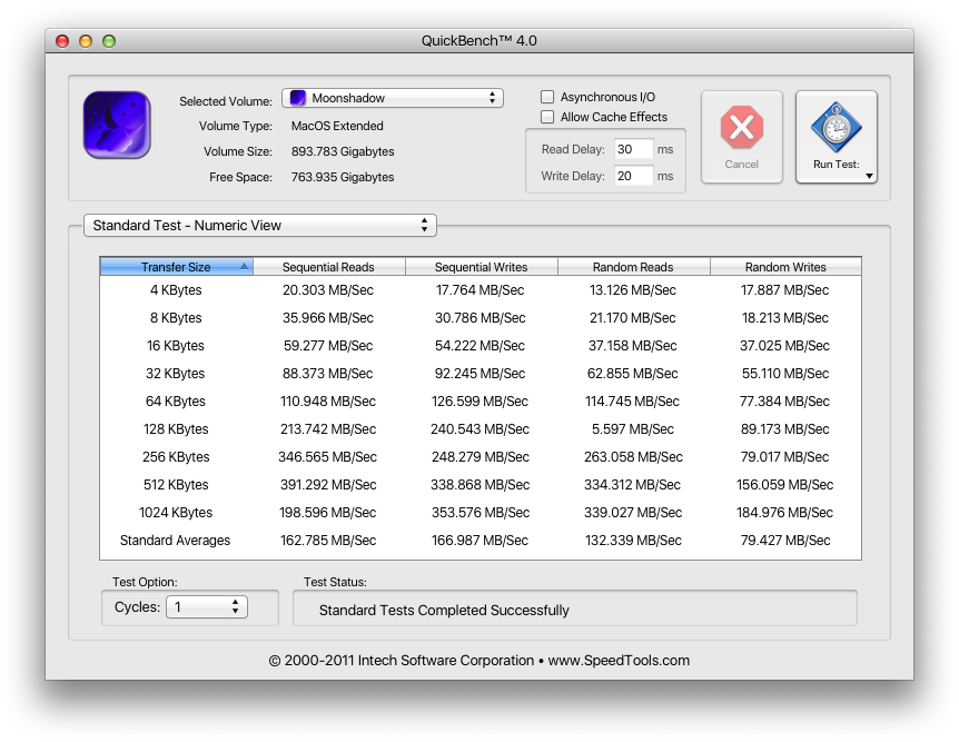 - 187 MB/s Read, 156 MB/s Write, according to Quickbench 4.0.5 Universal