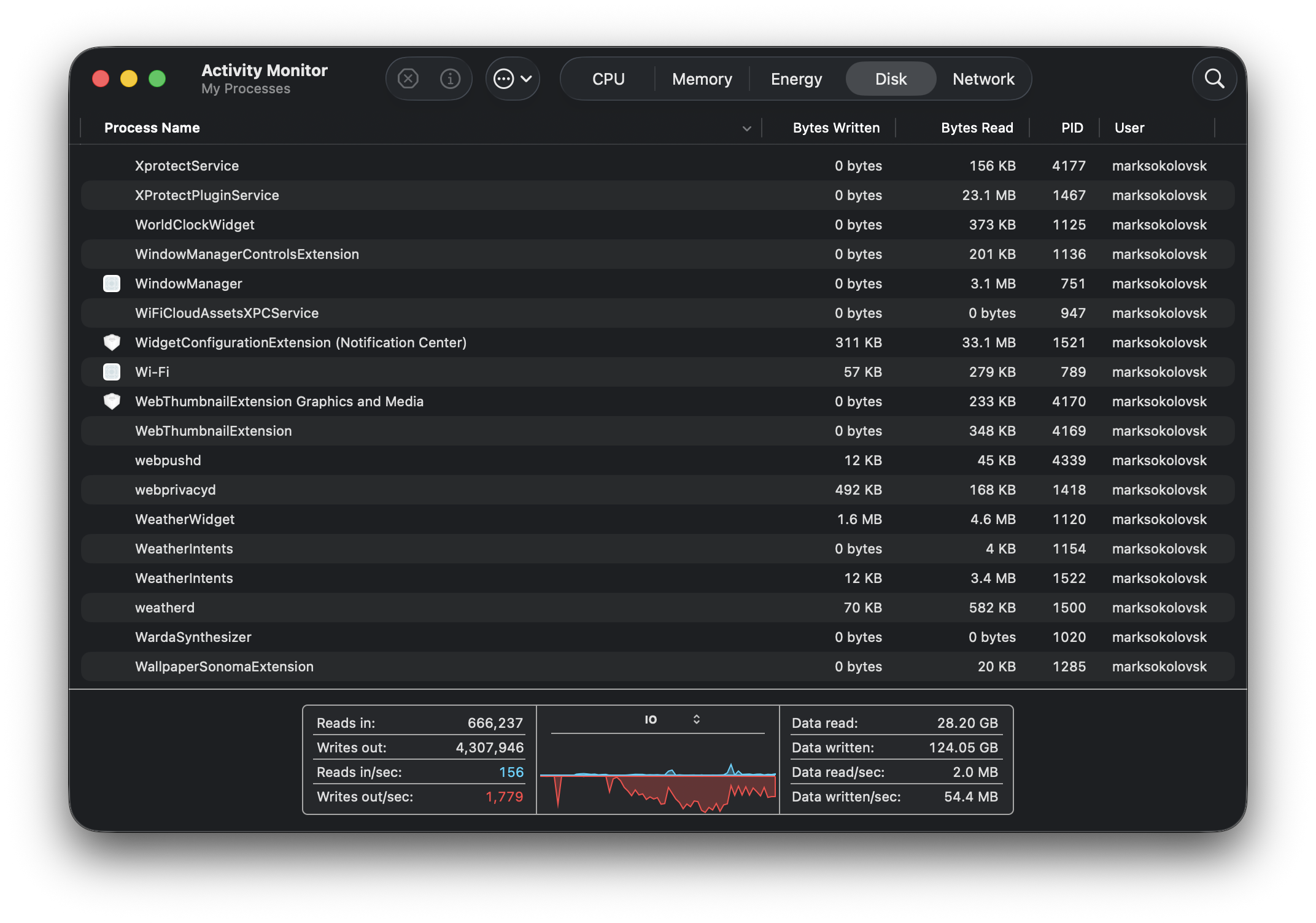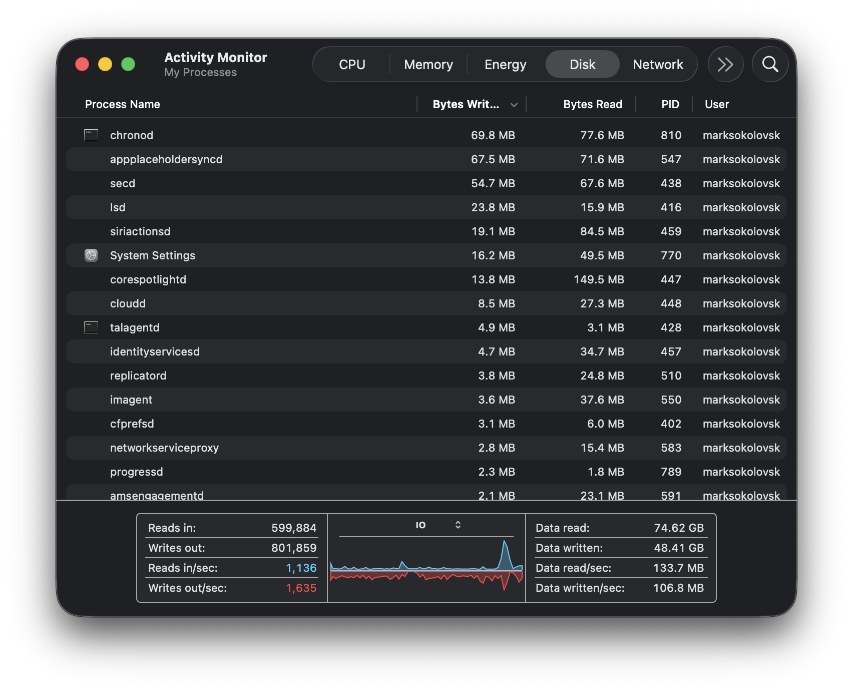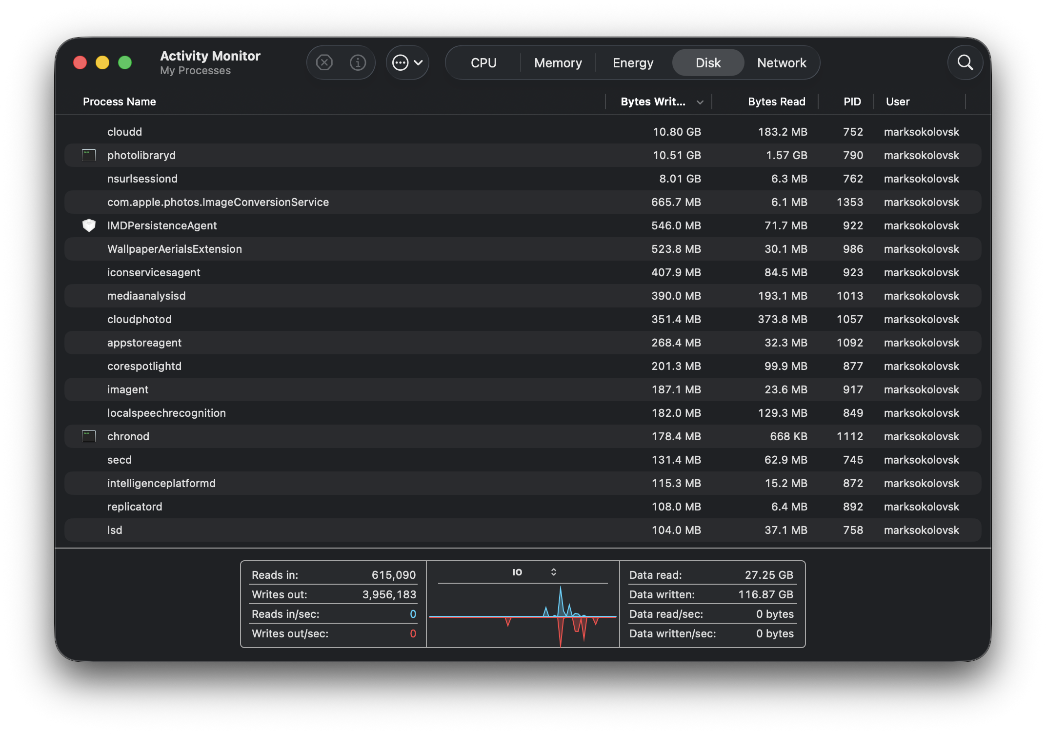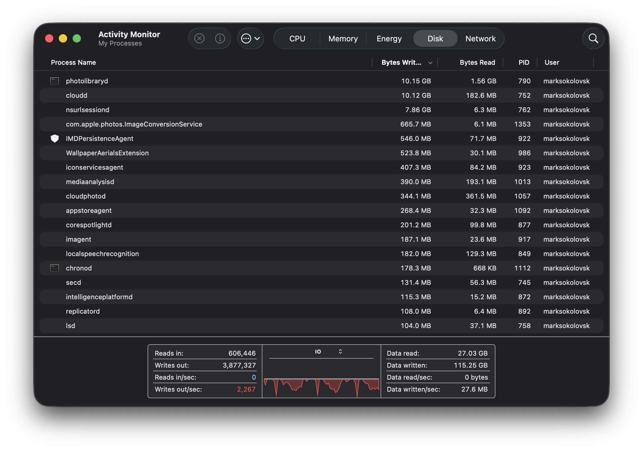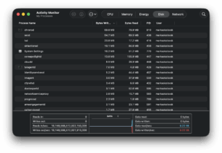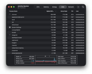 Activity Monitor no longer crashes like it once did, fortunately. This next pic makes more sense, as there are photos and data related to the data written to the SSD. In the second picture, it shows the data writes slowing down completely, suggesting the condition the Mac experienced earlier may or may not have something to do with the terminal command.