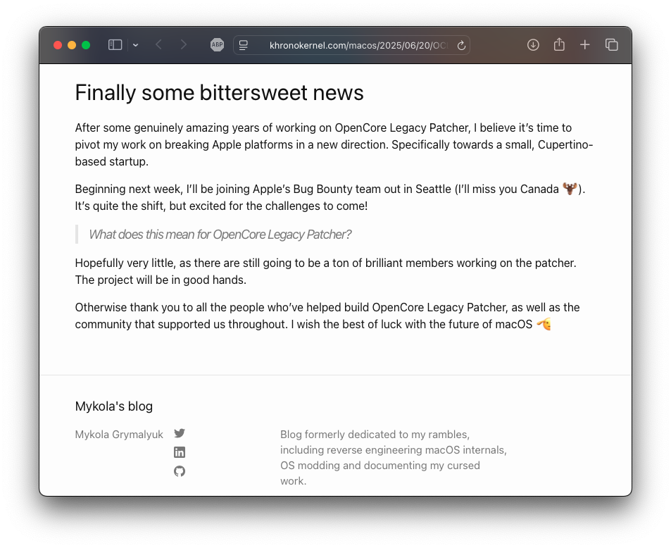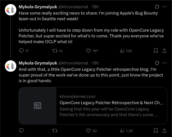 Yesterday on X, Mykola Grymalyuk announced his departure from the Open Core Legacy Patcher team, saying he will be joining Apple’s Bug Bounty team over in Seattle this coming week.