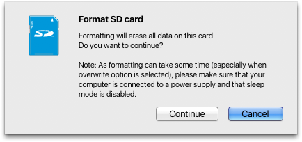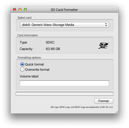 You’re going to want to have a USB to SD card adapter, to interface with the SD card of your choice. Once you plug it into your Mac, it should show right up on the app, and properly identify itself as to which type of SD card it may be: