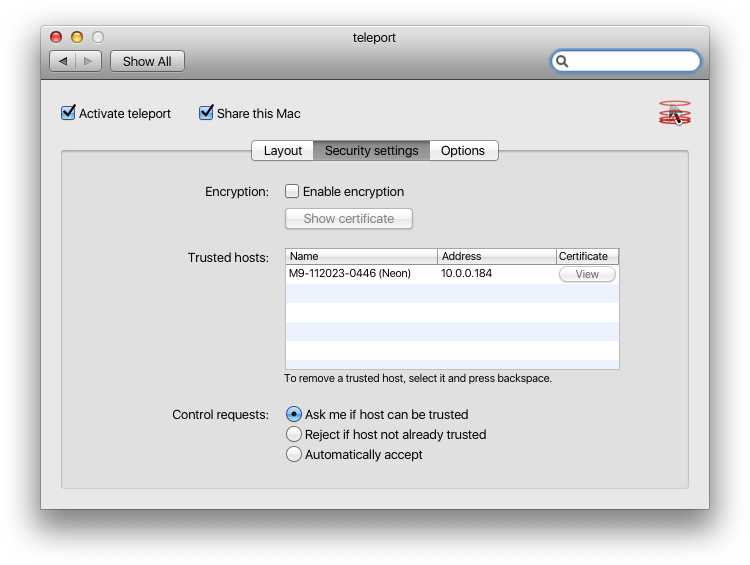 . - Control request settings (Ask to trust, reject if not already trusted, or auto-accept)