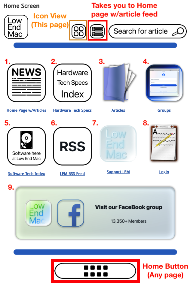 If you’re someone who’d rather have a set of buttons versus a news feed as your landing page.. now, “there’s an app for that“. Introducing Icon View for the Low End Mac home page – to go along with our website toolbar and news feed. This will not replace our beloved news feed of articles, but instead gives people the choice to use one or the other.