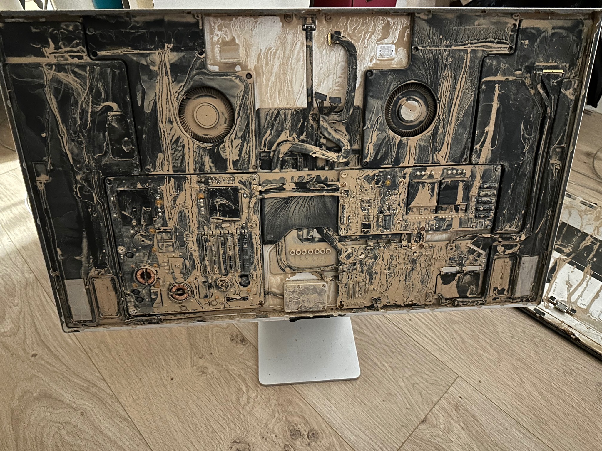 “The final result of the flood salvaged studio display… after power supply and display replacement, it lives again. All in I spent around 750€, and it has some scratches and bruises, so maybe not that wise financially, but it felt good to bring it back to life after what it went through!”