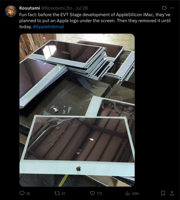 “Fun fact: before the EVT Stage development of AppleSilicon iMac, they’ve planned to put an Apple logo under the screen. Then they removed it until today. #AppleInternal” as Kosutami posted.